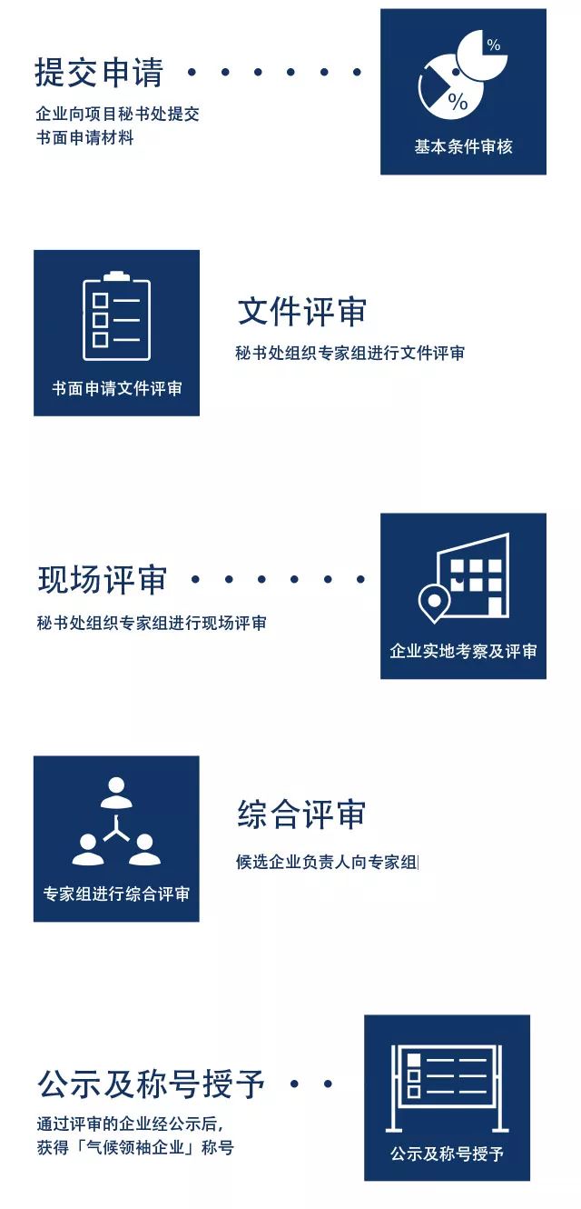 2.申請受理后,進入評審環節。評審分為文件評審、現場評審和綜合評審。專家組將根據“氣候領袖企業“評價指標體系,對企業進行評審。