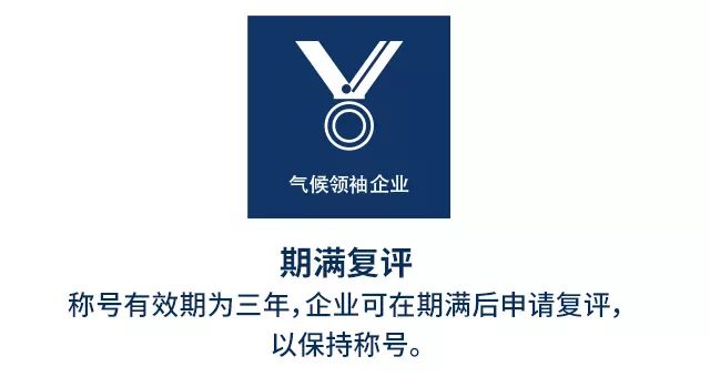 “氣候領袖企業”稱號有效期是三年。三年期滿后,企業可申請復評,以繼續保持該稱號。項目秘書處在收到企業復評申請后組織專家組對復評申請企業在有效期內領袖作用、碳排放貢獻情況做出評定;復評結果將在“氣候領袖企業”項目網站進行公示。